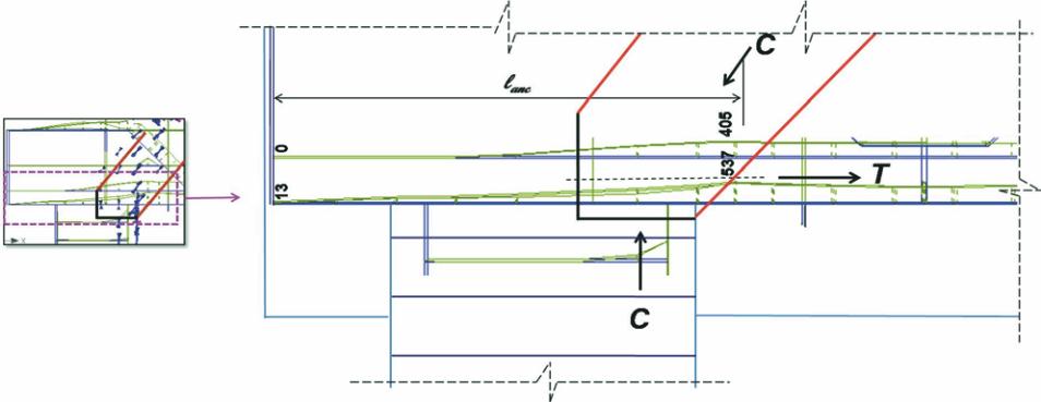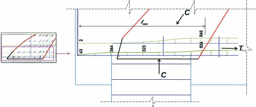 Figura 17 – Comprimento de ancoragem e tensões atuantes (em MPa) nos tirantes na região